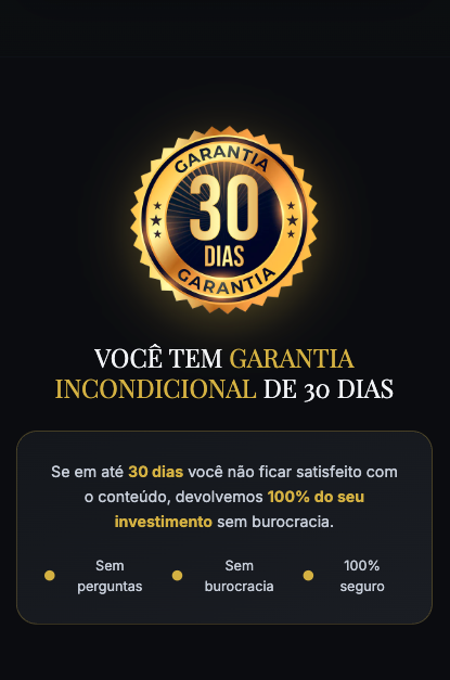 Você tem 30 dias de garantia incondicional. Se não gostar do material, devolvemos 100% do seu dinheiro sem fazer perguntas.